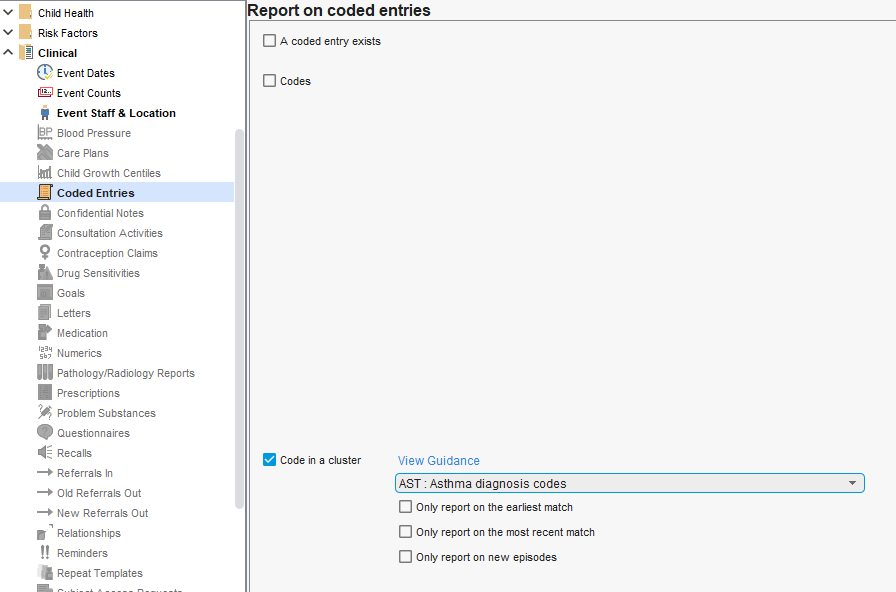 Example of using Codes in a cluster (Asthma diagnosis codes selected) rather than manually defining a code list with the Codes option: